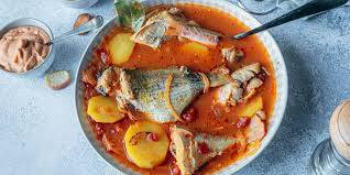 Bouillabaisse provençale des Alpilles: poissons de roche mijotés dans bouillon ail/fenouil/safran/zeste d'orange, servi avec pommes de terre, rouille à l'huile d'olive locale.